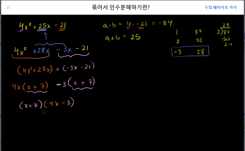 - 그림을 보면 x²항의 상수 4와 -21을 곱하면 -84가 나온다.